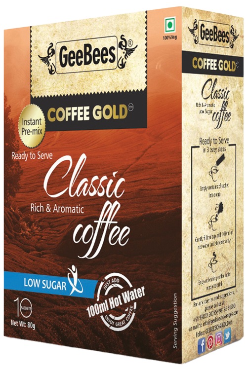GeeBees Coffee Gold Instant Premix Coffee Low Sugar, Box of 10 Sachet quantity